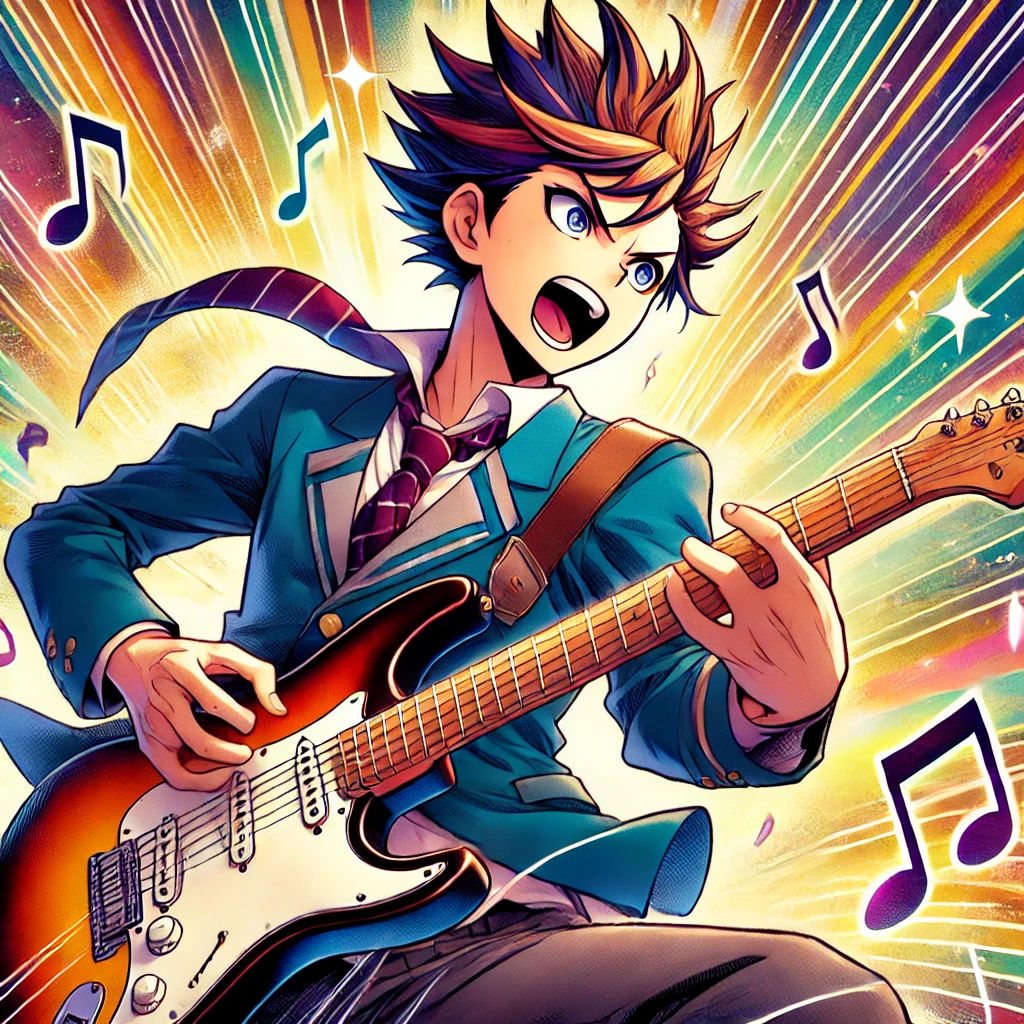 DALL·E 2025-03-04 05.59.41 - A colorful manga-style illustration of a high school student playing a Stratocaster electric guitar. The student has spiky hair and an excited express