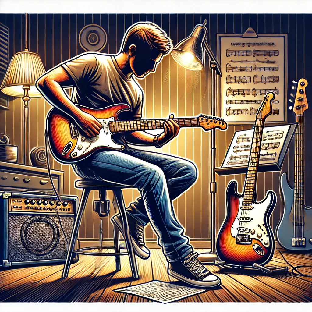 DALL·E 2025-01-04 17.56.30 - A dynamic and visually striking illustration of an electric guitar player practicing beginner techniques. The player is seated on a stool, focused on